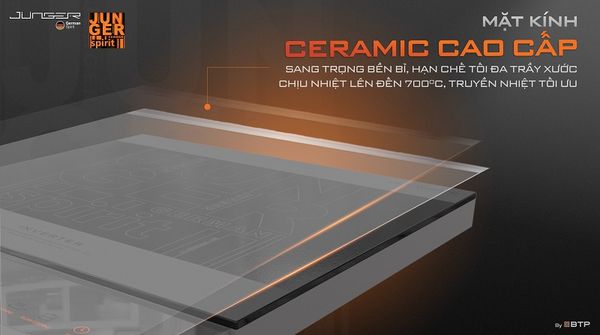 Bếp sử dụng mặt kính Ceramic sang trọng, chịu nhiệt cao, chống trầy xước tốt và giúp truyền nhiệt tối ưu. Ngoài ra, mặt kính chỉ nóng lên ở vùng nấu, giúp tiết kiệm năng lượng và đảm bảo an toàn.