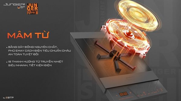 Mâm từ đường kính 17cm, chế tạo từ 27 vòng dây đồng nguyên chất và phủ lớp Emay cách điện tiêu chuẩn Châu Âu. Hệ thống 18 thanh hướng từ giúp tập trung từ trường hiệu quả, đảm bảo gia nhiệt nhanh và đồng đều.