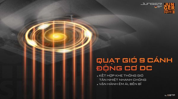 Hệ thống quạt gió 9 cánh sử dụng động cơ DC mạnh mẽ, giúp bếp tản nhiệt nhanh chóng và vận hành ổn định ngay cả trong môi trường nóng ẩm.