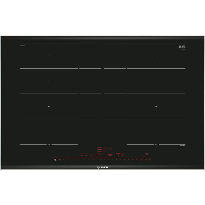 Bếp từ Bosch PXY875DC1E thuộc dòng Serie 8 với thiết kế viền nhôm trắng hai bên chắc chắn, giúp sản phẩm bền đẹp trong quá trình sử dụng. Cạnh trước và sau được vát tinh tế, tạo nên sự mềm mại, sang trọng cho không gian bếp.