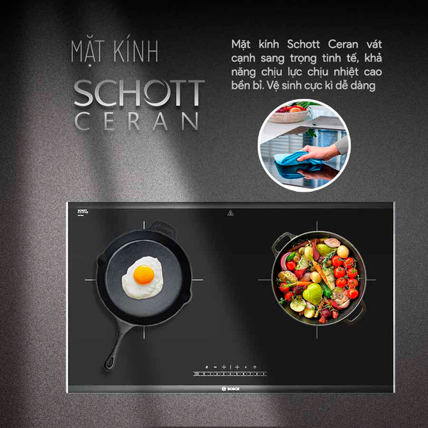 Bếp từ Bosch PPI82560MS Serie 8 sử dụng mặt kính Schott Ceran – một trong những loại kính cao cấp nhất hiện nay. Mặt kính này không chỉ có khả năng chịu nhiệt, chịu lực tốt mà còn giúp tăng tính thẩm mỹ cho gian bếp. Bề mặt kính nhẵn mịn giúp dễ dàng lau chùi, vệ sinh sau mỗi lần sử dụng. Ngoài ra, bếp còn được trang bị mâm từ CGO cao cấp với khả năng nhận diện đáy nồi chính xác, giúp tập trung nhiệt lượng vào vùng nấu, tránh thất thoát năng lượng.