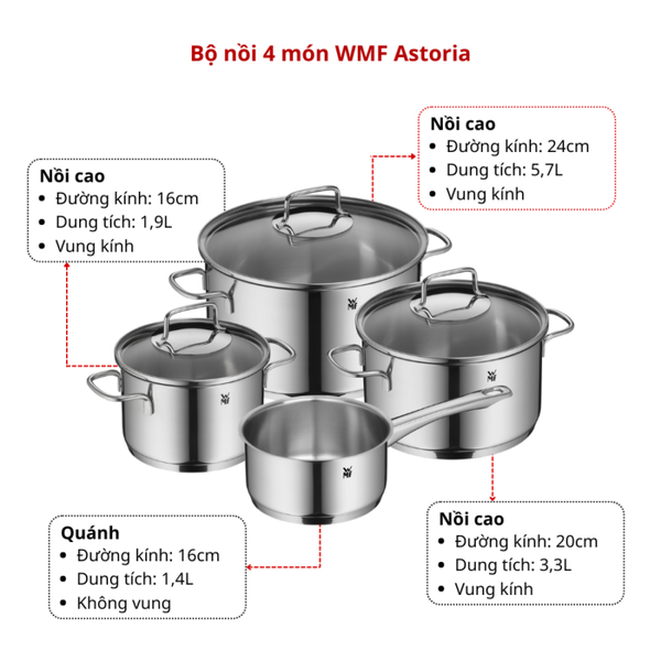 Với Bộ nồi 4 món WMF Astoria, bạn sẽ sở hữu một bộ nồi không chỉ đẹp mắt, chất lượng mà còn tích hợp nhiều công nghệ thông minh, giúp công việc bếp núc trở nên dễ dàng và thú vị hơn bao giờ hết.