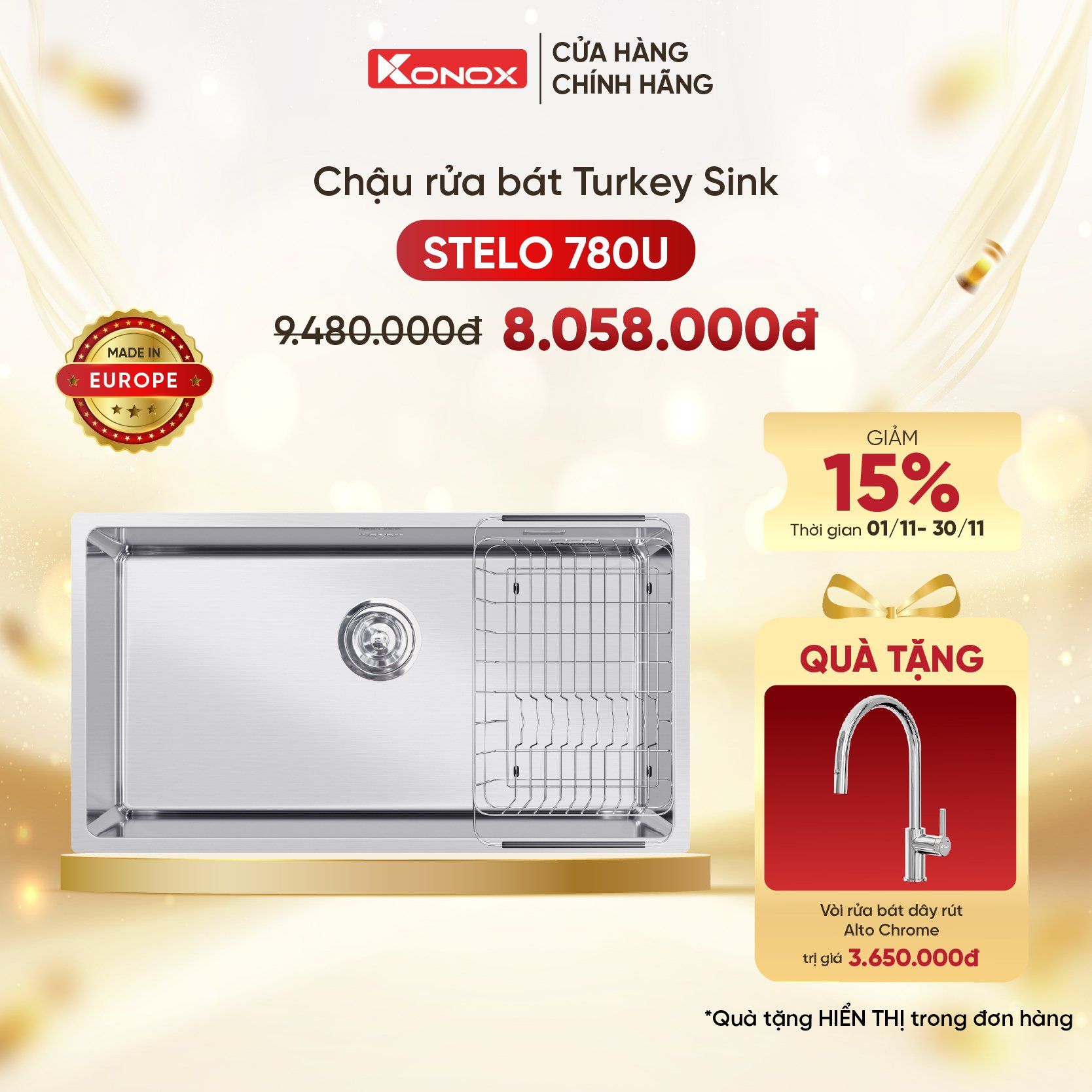 Chậu rửa bát Stelo 780U ra mắt năm 2025 là phiên bản chậu 1 hố mới nhất thuộc bộ sưu tập chậu rửa Turkey Series của Konox.