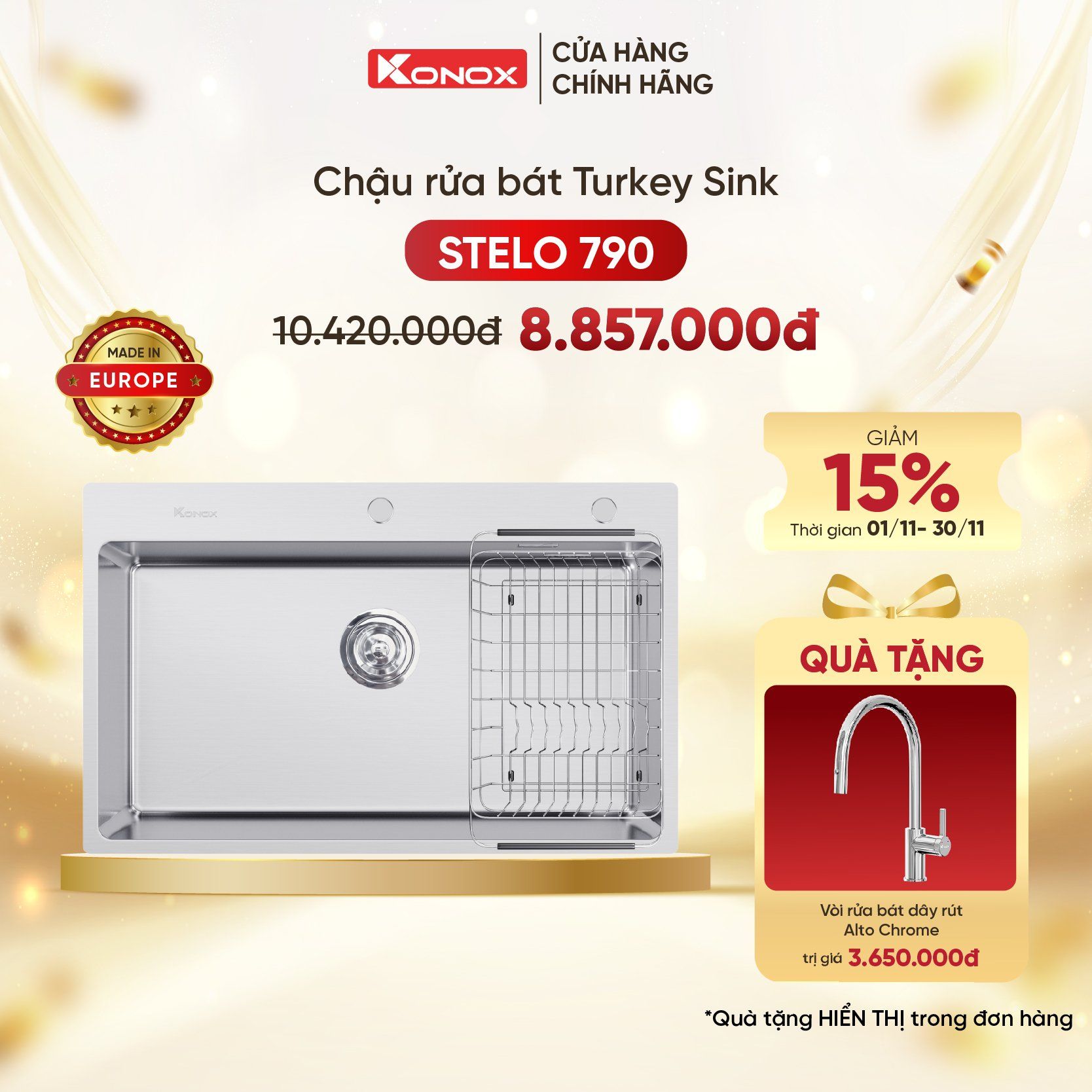 Khi mua Chậu rửa bát âm tủ Konox STELO 790 Tặng vòi dây rút Alto Chrome
