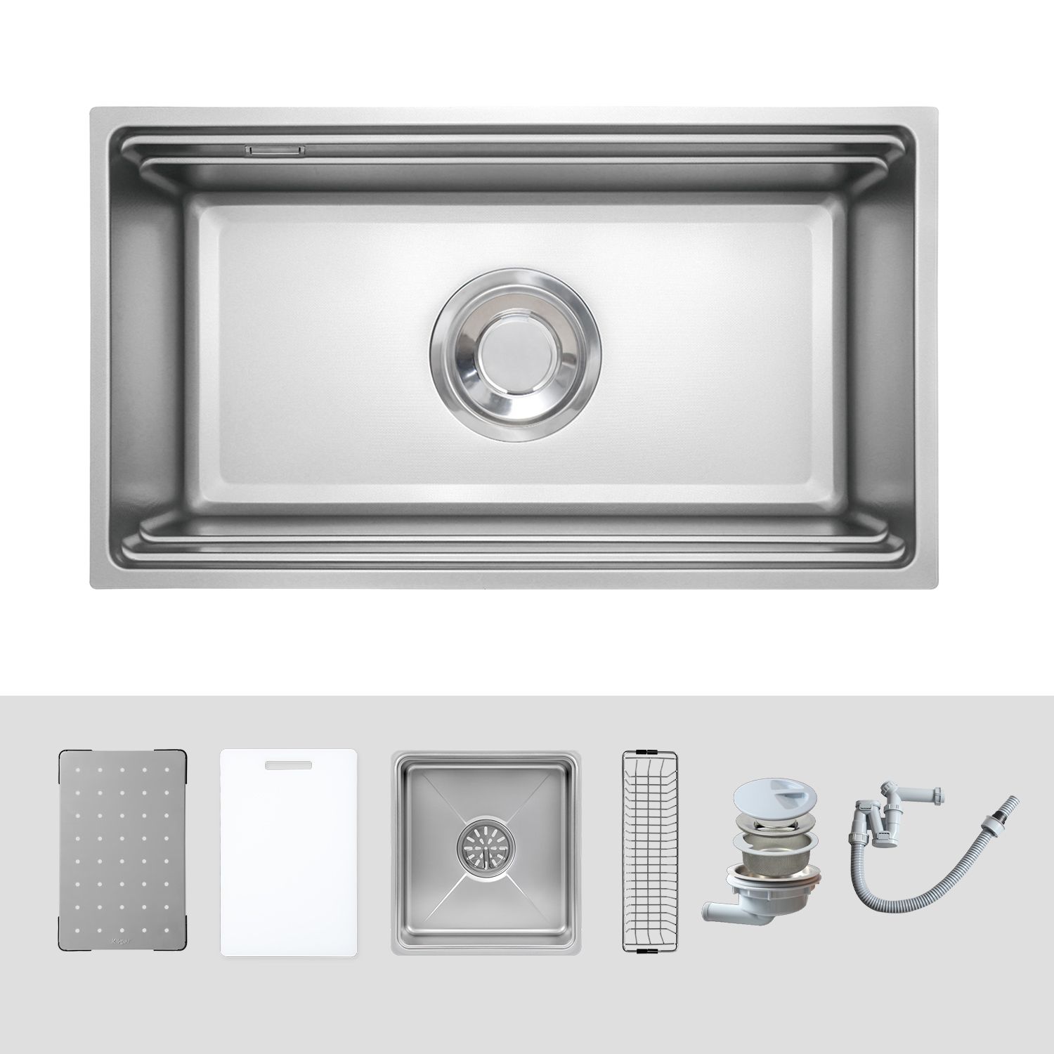 Bộ sản phẩm bao gồm: 01 chậu rửa + 01 bát rác + 01 Siphon + 01 giỏ inox + 01 thớt nhựa + 01 thớt inox có lỗ + 01 chậu rửa nhỏ.