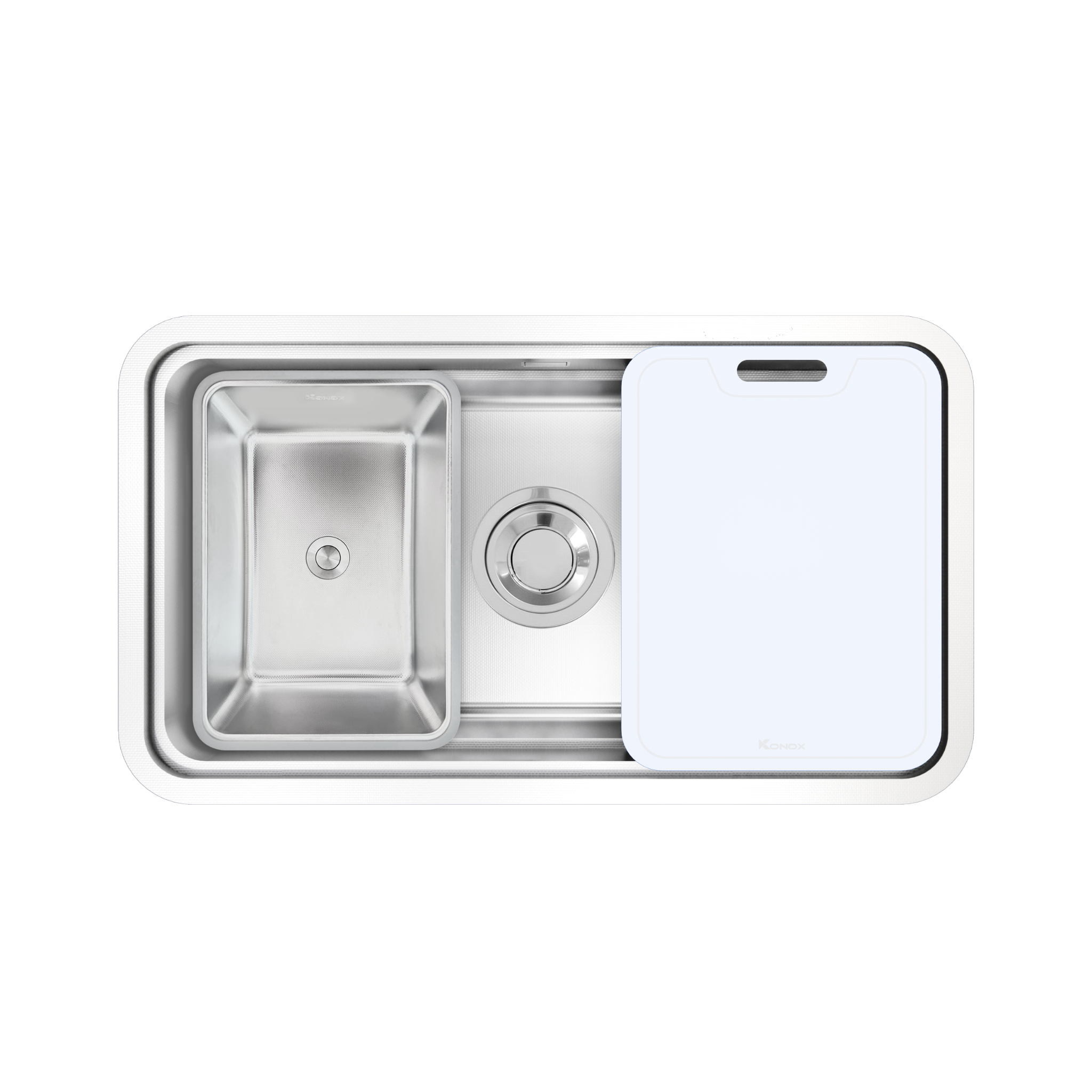 - Thiết kế hiện đại với gờ hạ bậc – tích hợp phụ kiện thông minh: Siphon, giá úp bát inox, chậu rửa nhỏ, thớt nhựa, thớt inox lỗ