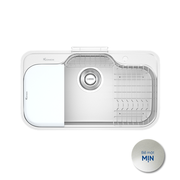 - Tích hợp phụ kiện thông minh: Thớt nhựa, rổ phụ, giá úp bát, siphon.