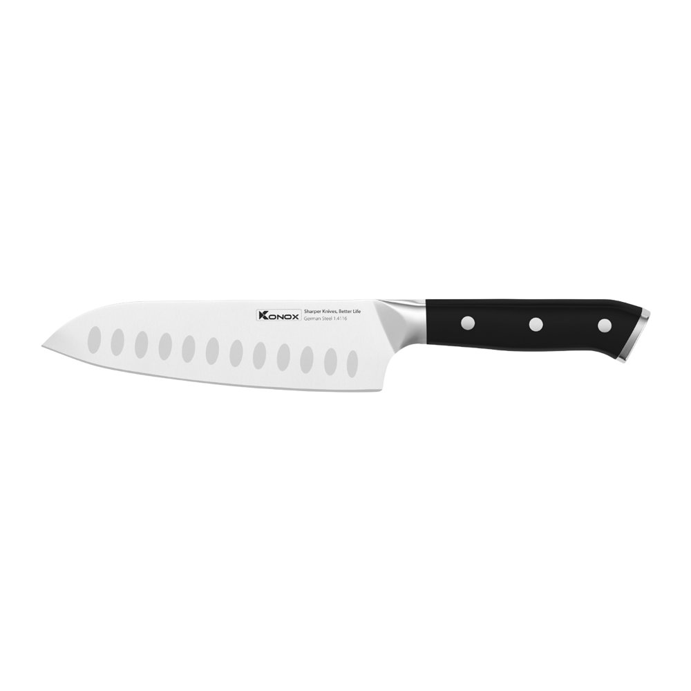 Dao Konox Emmitt Santoku là sự lựa chọn lý tưởng cho những ai yêu thích sự linh hoạt trong nhà bếp. Với lưỡi dao dài 7 inch, mỏng và sắc bén, Santoku giúp bạn dễ dàng thực hiện các thao tác cắt, thái từ thịt, cá đến rau củ, trái cây. Thiết kế nhẹ nhàng, dễ cầm nắm giúp người dùng thao tác dễ dàng và chính xác. Đặc biệt, lưỡi dao còn được trang bị các rãnh hình vỏ sò, giúp ngăn thức ăn dính vào dao khi cắt, mang lại hiệu quả sử dụng tối ưu. Đây là con dao không thể thiếu trong mọi gian bếp, giúp tiết kiệm thời gian và nâng cao sự tiện lợi trong việc chuẩn bị món ăn.