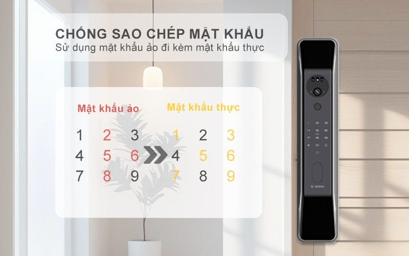 - Mật khẩu ảo, mã xáo trộn lên đến 32 ký tự: Khóa hỗ trợ tính năng xáo trộn mã giúp người dùng có thể nhập thêm các ký tự bất kỳ trước hoặc sau mật khẩu thật.