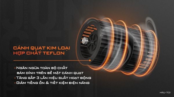 Cánh quạt kim loại của máy hút mùi Junger HRJ-701 được phủ lớp Teflon hoàn thiện, giúp giảm ma sát và tiếng ồn trong quá trình vận hành. Ngoài ra, lớp phủ Teflon còn ngăn ngừa bụi bẩn và dầu mỡ bám vào bề mặt, giúp nâng cao hiệu quả hoạt động của quạt hút.