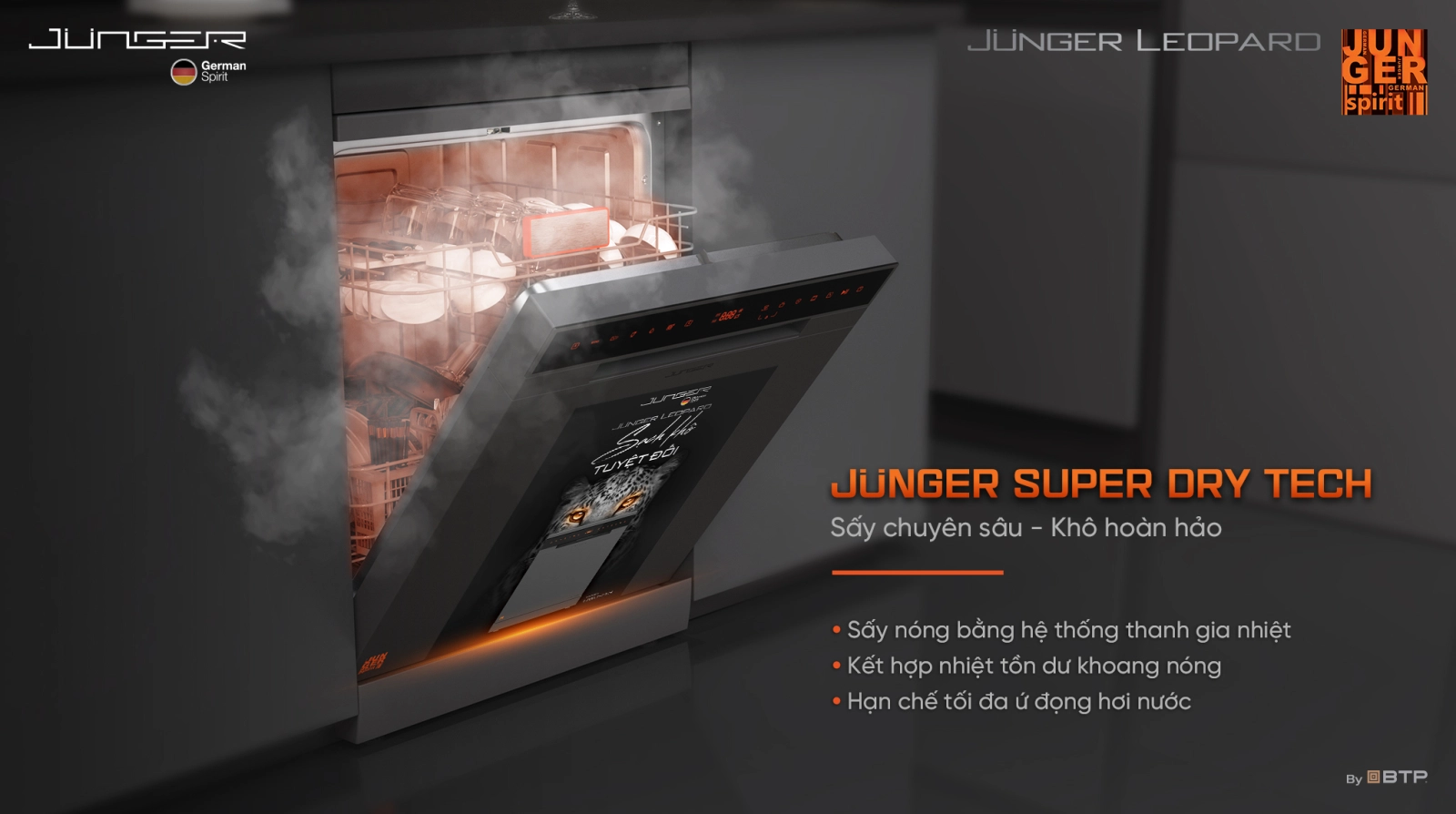 Công Nghệ Sấy Nóng Junger Super Dry Tech: Sử dụng thanh gia nhiệt kết hợp với quạt gió đối lưu, giúp làm khô chén bát hiệu quả và tiết kiệm năng lượng.