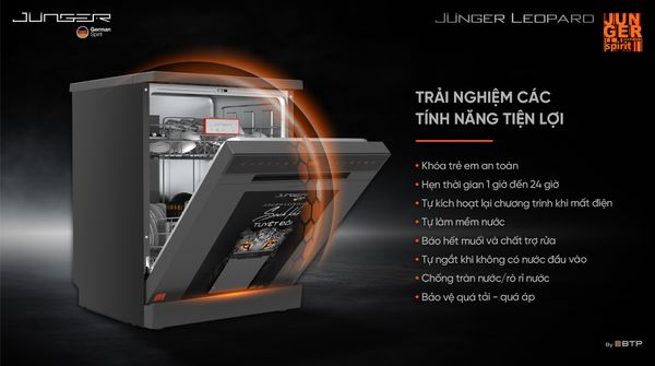 Junger Leopard DWJ-143 không chỉ chú trọng hiệu quả rửa mà còn tích hợp các tính năng an toàn như khóa bảng điều khiển, hẹn giờ, ghi nhớ chương trình khi mất điện, và tự ngắt khi phát hiện rò rỉ nước.