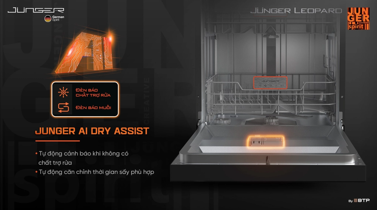 Junger tiếp tục nâng tầm trải nghiệm người dùng với Junger AI Dry Assist – công nghệ sấy thông minh tiên tiến được tích hợp trên dòng máy rửa bát Junger Leopard DWJ-183-VG.