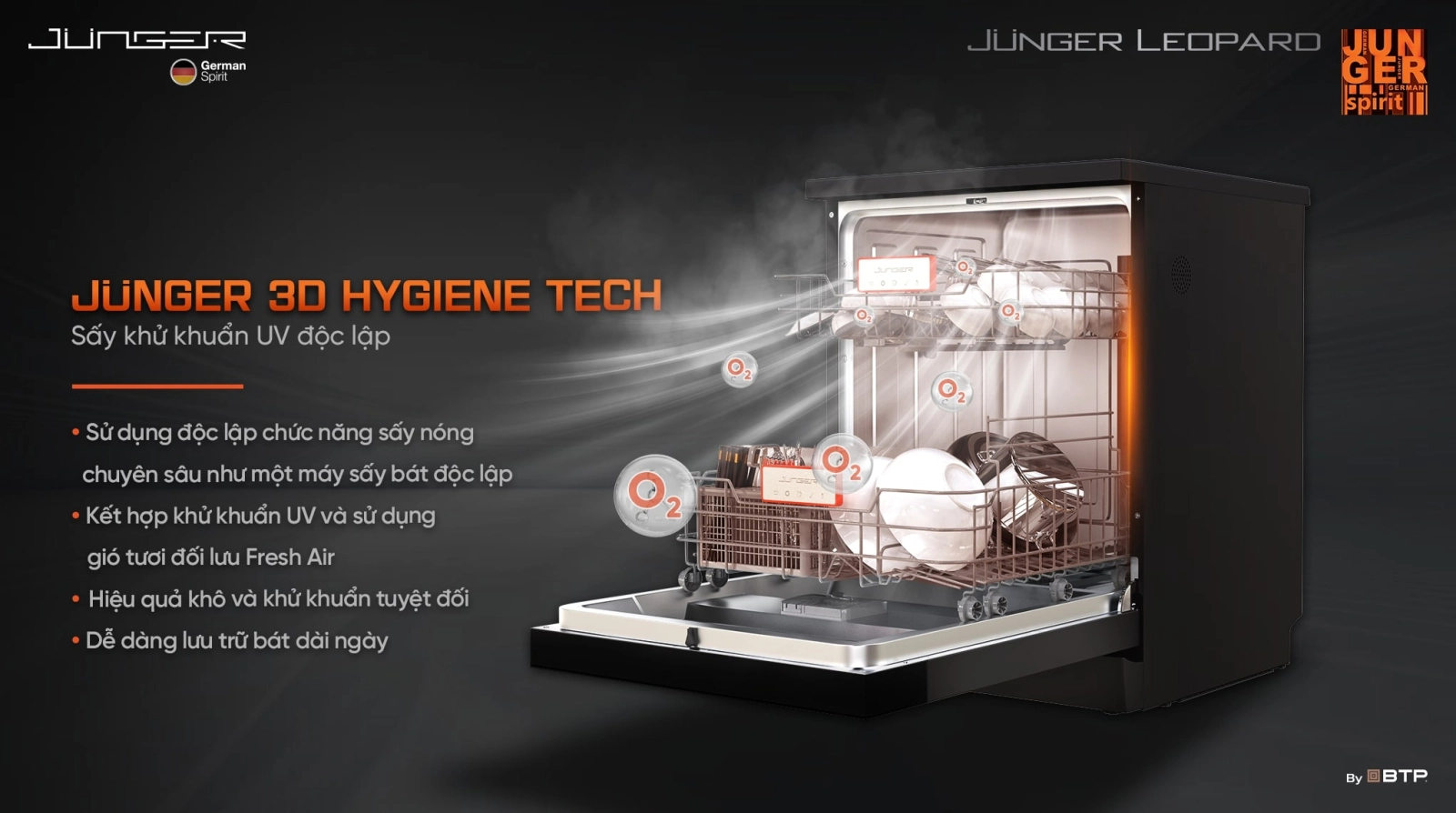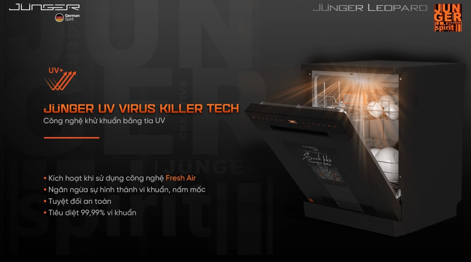 Khử trùng sạch tuyệt đối và an toàn ngay cả với bình sữa cho trẻ sơ sinh! Đây là những tuyên bố đanh thép đã tạo ra rất nhiều sự chú ý ngay từ khi máy rửa bát Junger Leopard ra mắt với công nghệ UV Virus Killer độc quyền. Junger Leopard DWJ-183-VG mang đến khả năng làm sạch và khử khuẩn vượt trội, kết hợp nước nóng 75℃, tiệt trùng bằng tia UV Virus Killer Tech, sấy khô Junger Super Dry và khử mùi bằng gió tươi đối lưu Fresh Air. Sự kết hợp hoàn hảo này giúp tiêu diệt đến 99,99% vi khuẩn, ngăn ngừa nấm mốc, đồng thời loại bỏ hoàn toàn mùi hôi, đảm bảo bát đĩa luôn sạch khuẩn và an toàn tuyệt đối cho sức khỏe. Đặc biệt, chức năng khử trùng bằng tia UV sẽ tự động kích hoạt ở mọi chế độ rửa, mang đến sự bảo vệ toàn diện trong từng chu trình vận hành.