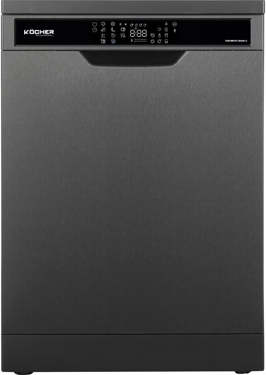 Máy rửa bát Kocher KDEU8855S7 có công suất tiêu thụ là 1900W, lượng nước tiêu thụ là 5.4-9 lít/1 lần rửa, cho phép rửa 15 bộ bát đĩa Châu Âu tương đương với 1,5-2 bữa ăn Việt (gia đình 4-6 thành viên). Máy trang bị 10 chương trình rửa được tùy chỉnh dễ dàng trên bảng điều khiển điện tử kết hợp màn hình LED.
