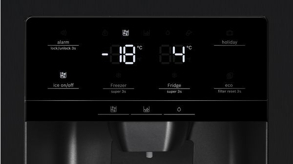 - Thuộc dòng tủ lạnh Side By Side được thiết kế 2 cánh, màu đen sang trọng với chất liệu cửa tủ làm bằng kính không viền tinh tế, phù hợp cho mọi vị trí bên trong nhà bếp.