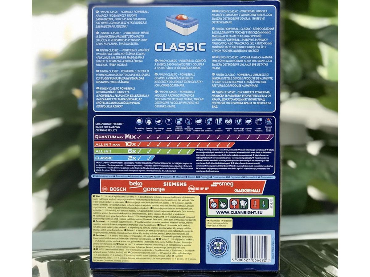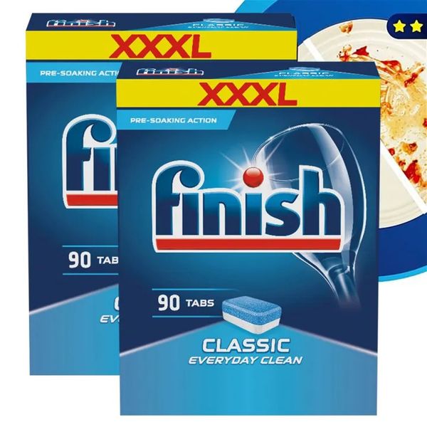Viên rửa chén Finish Classic 90 taps – Cho chén đĩa luôn luôn sạch bóng. Với công nghệ enzyme đặc biệt giúp diệt khuẩn, loại bỏ bụi bẩn, dầu mỡ, vết bẩn khô thậm chí là vết cháy trên xoong nồi, chén đĩa, các đồ sành sứ, thủy tinh, inox và các dụng cụ nhà bếp. Hộp 90 viên rửa chén Finish Classic Dishwasher Tablets (là viên rửa chén cao cấp chuyên dùng cho máy rửa chén).